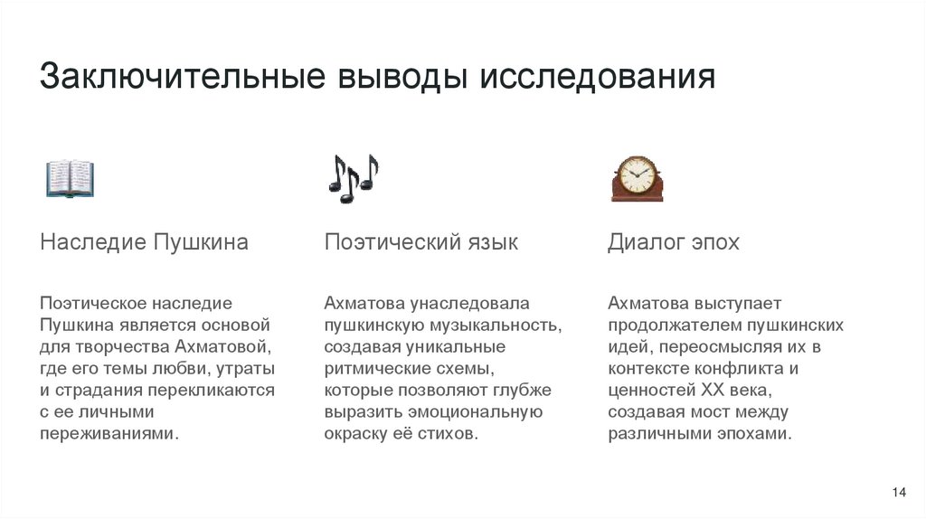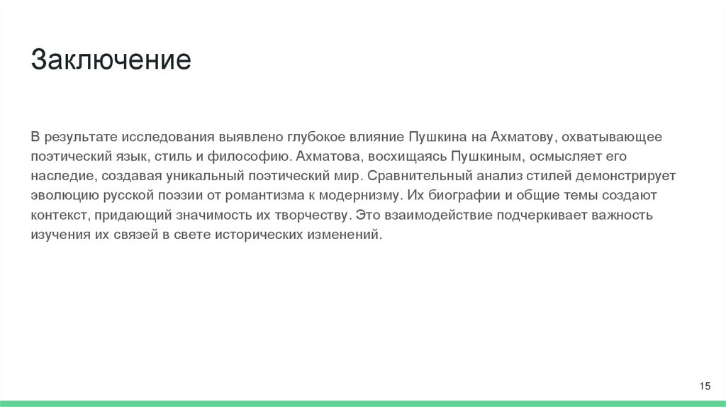ЗаключениеВ результате исследования выявлено глубокое влияние Пушкина на Ахматову, охватывающее