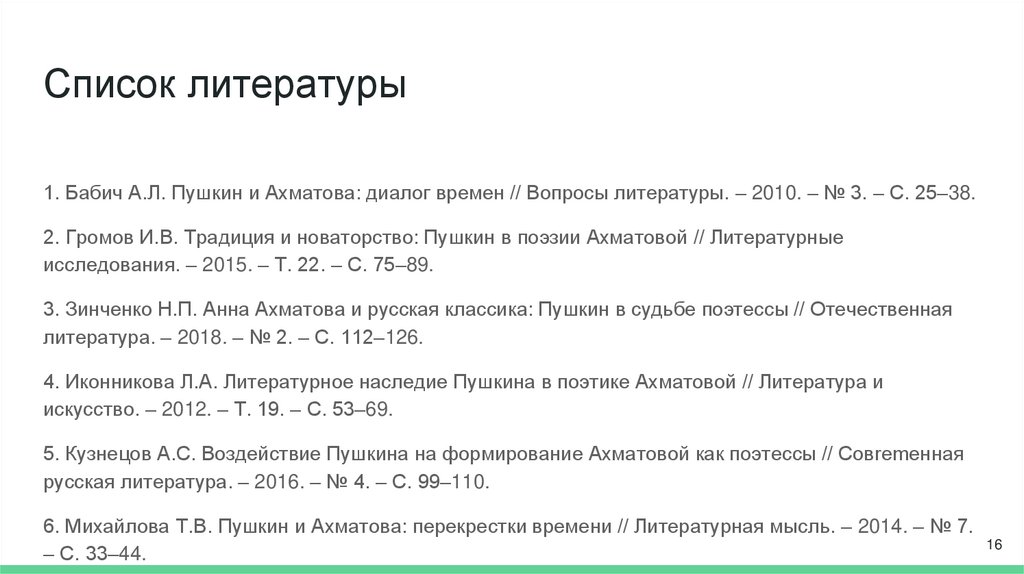 Список литературы1. Бабич А.Л. Пушкин и Ахматова: диалог времен // Вопросы литературы. – 2010. – № 3. – С. 25–38.
