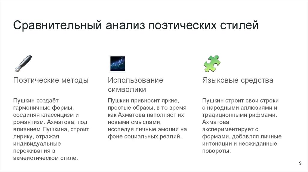 Задачи1. Анализ статей Анны Ахматовой о Пушкине. 2. Сравнительный анализ поэтических стилей