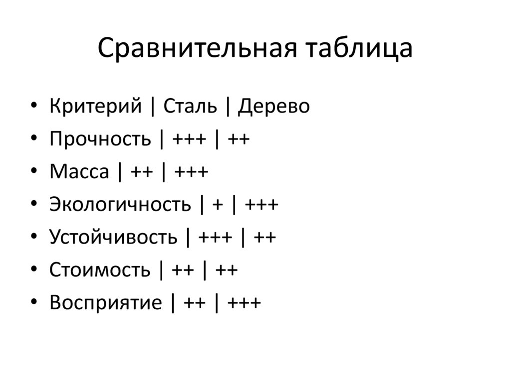 Сравнительная таблица• Критерий | Сталь | Дерево