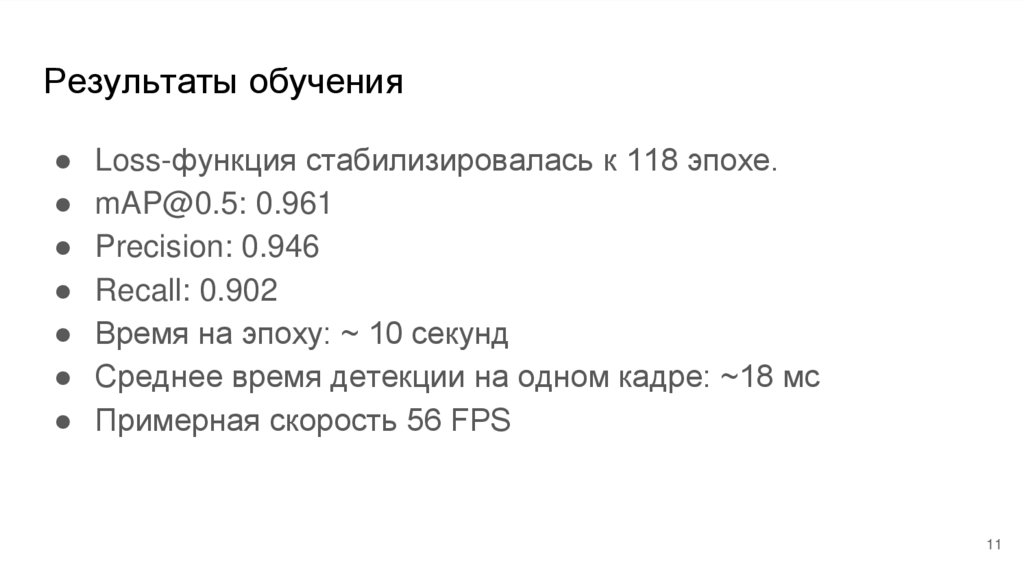 Результаты обученияLoss-функция стабилизировалась к 118 эпохе.