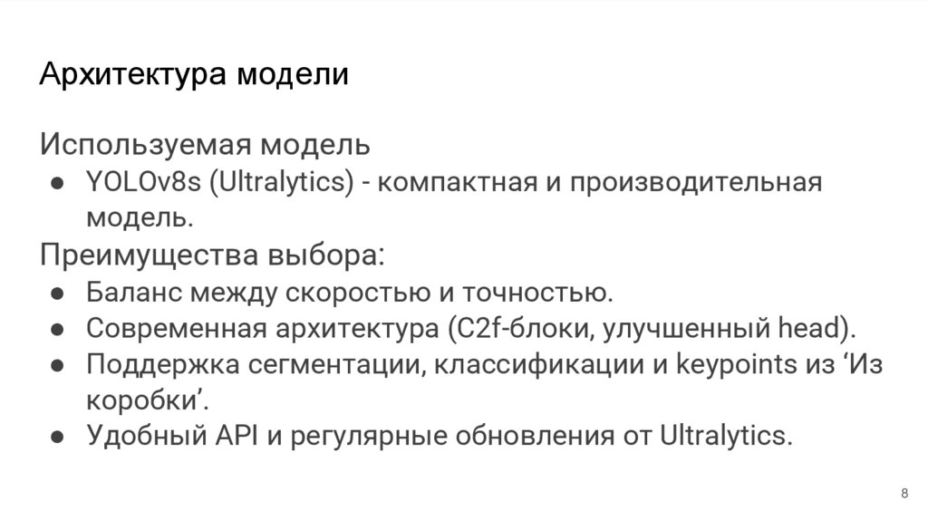 ● Современная архитектура (C2f-блоки, улучшенный head).