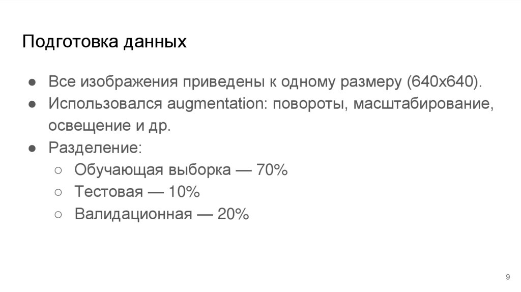 Подготовка данных● Все изображения приведены к одному размеру (640x640).