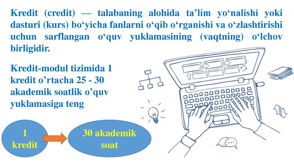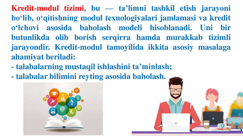 Kredit-modul tizimi, bu — ta’limni tashkil etish jarayonibo‘lib, o‘qitishning modul texnologiyalari jamlamasi va kredit