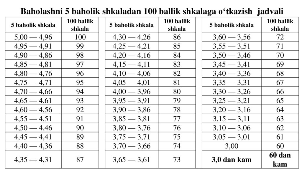 GPA (Grade Point Average) — ta’lim oluvchining dasturbo‘yicha o‘zlashtirgan ballari o‘rtacha qiymati bo‘lib, u quyidagi