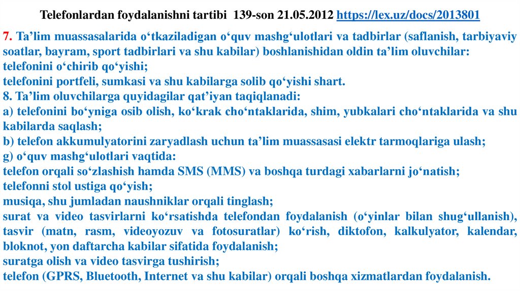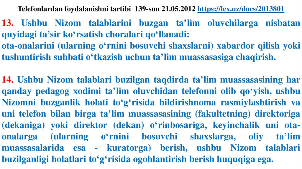 Telefonlardan foydalanishni tartibi 139-son 21.05.2012 https://lex.uz/docs/201380113. Ushbu Nizom talablarini buzgan ta’lim oluvchilarga nisbatan