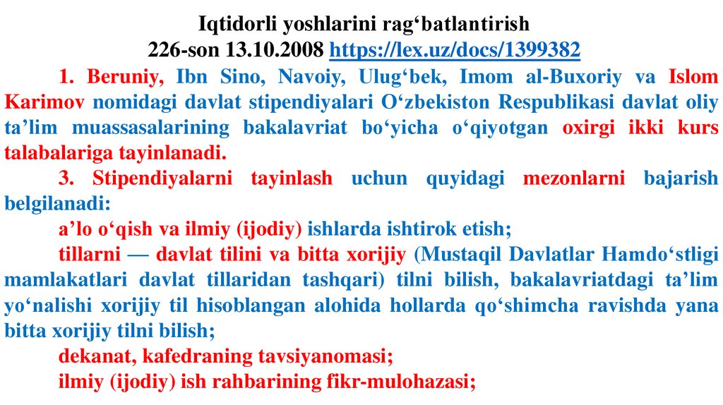 Iqtidorli yoshlarini rag‘batlantirish226-son 13.10.2008 https://lex.uz/docs/1399382