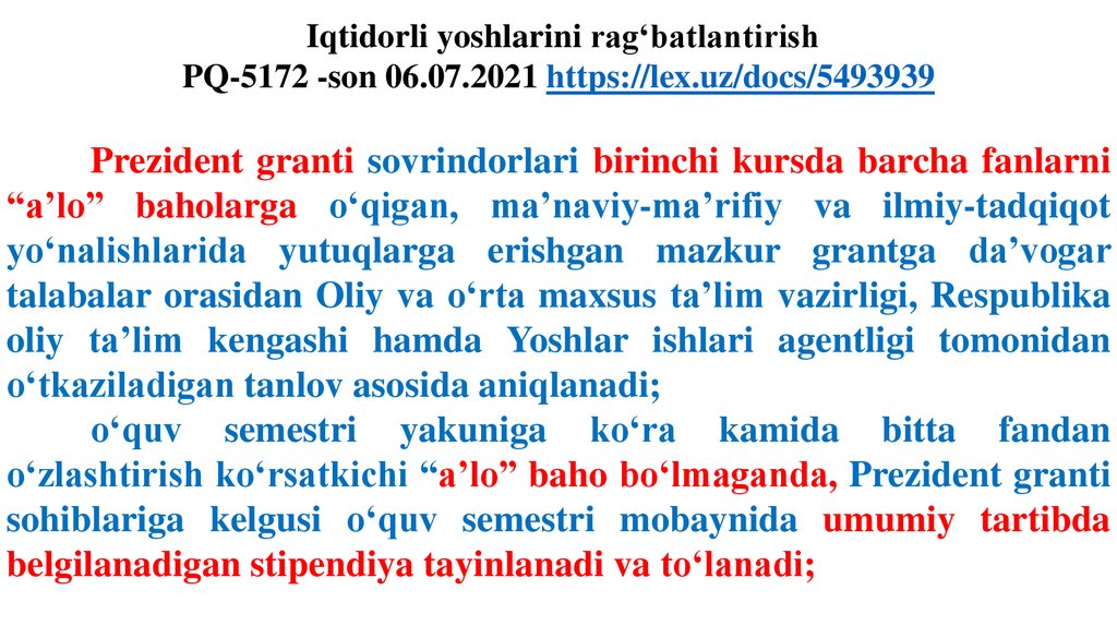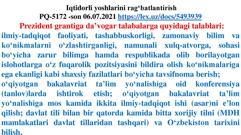 Iqtidorli yoshlarini rag‘batlantirishPQ-5172 -son 06.07.2021 https://lex.uz/docs/5493939