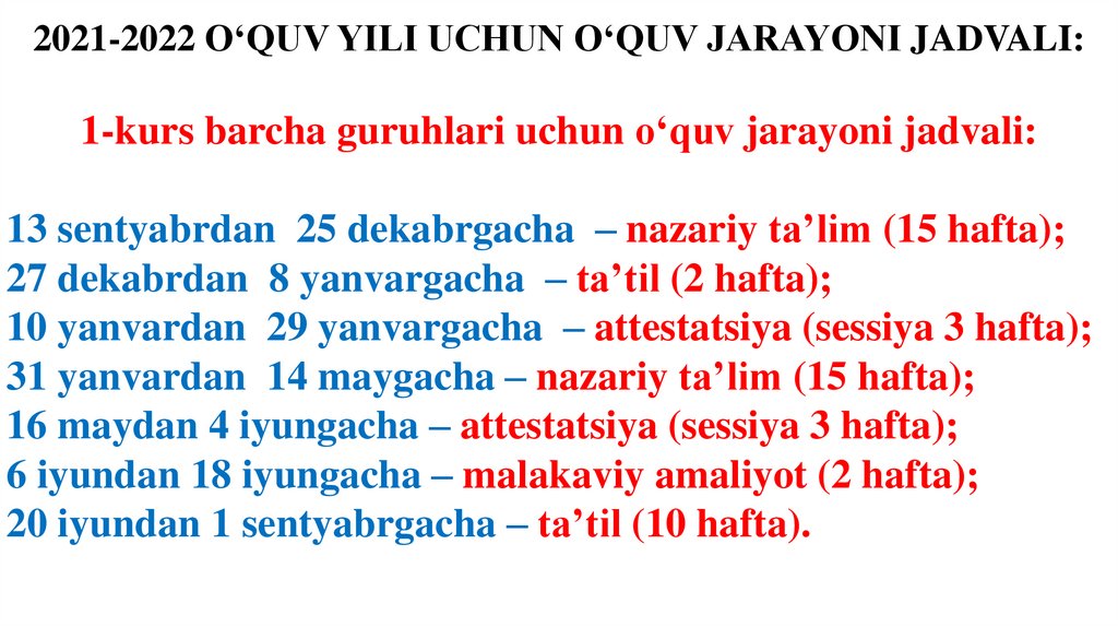 2 sentyabrdan 11 dekabrgacha – nazariy ta’lim (15 hafta);