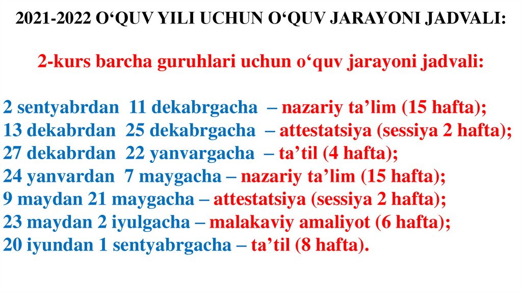 2021-2022 O‘QUV YILI UCHUN O‘QUV JARAYONI JADVALI:2-kurs barcha guruhlari uchun o‘quv jarayoni jadvali:
