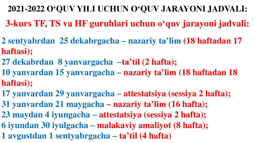 2021-2022 O‘QUV YILI UCHUN O‘QUV JARAYONI JADVALI:3-kurs TF, TS va HF guruhlari uchun o‘quv jarayoni jadvali: