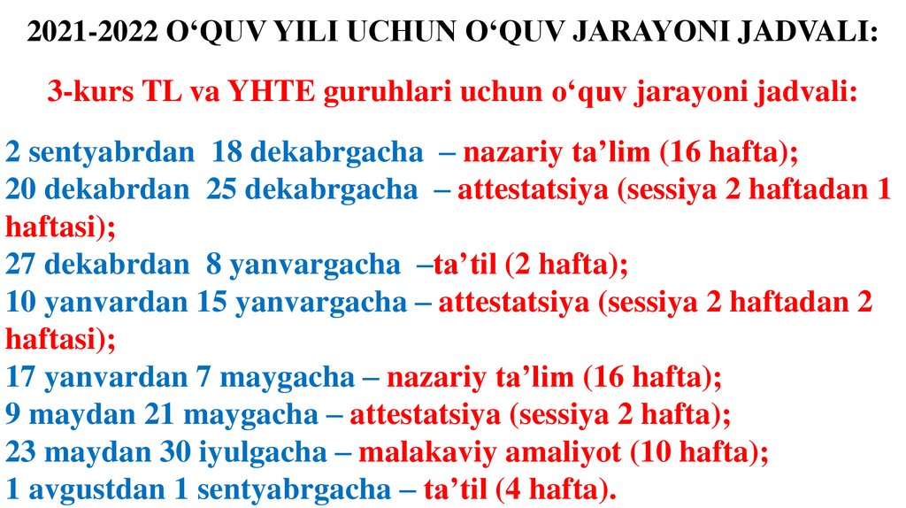 2021-2022 O‘QUV YILI UCHUN O‘QUV JARAYONI JADVALI:3-kurs TL va YHTE guruhlari uchun o‘quv jarayoni jadvali:
