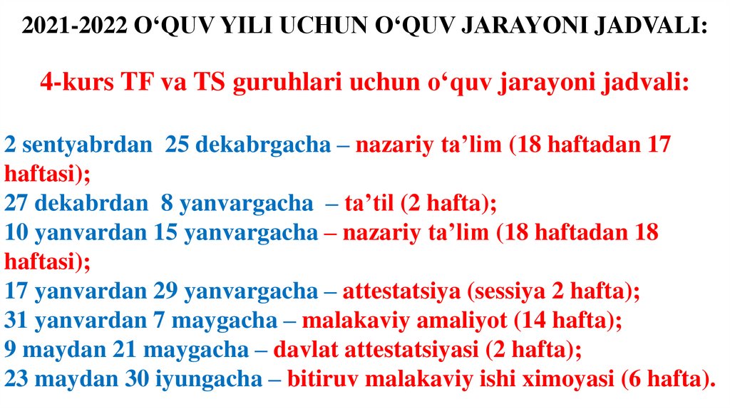 2021-2022 O‘QUV YILI UCHUN O‘QUV JARAYONI JADVALI:4-kurs TF va TS guruhlari uchun o‘quv jarayoni jadvali: