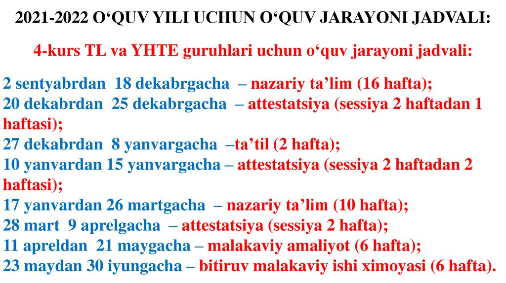 2021-2022 O‘QUV YILI UCHUN O‘QUV JARAYONI JADVALI:4-kurs TL va YHTE guruhlari uchun o‘quv jarayoni jadvali: