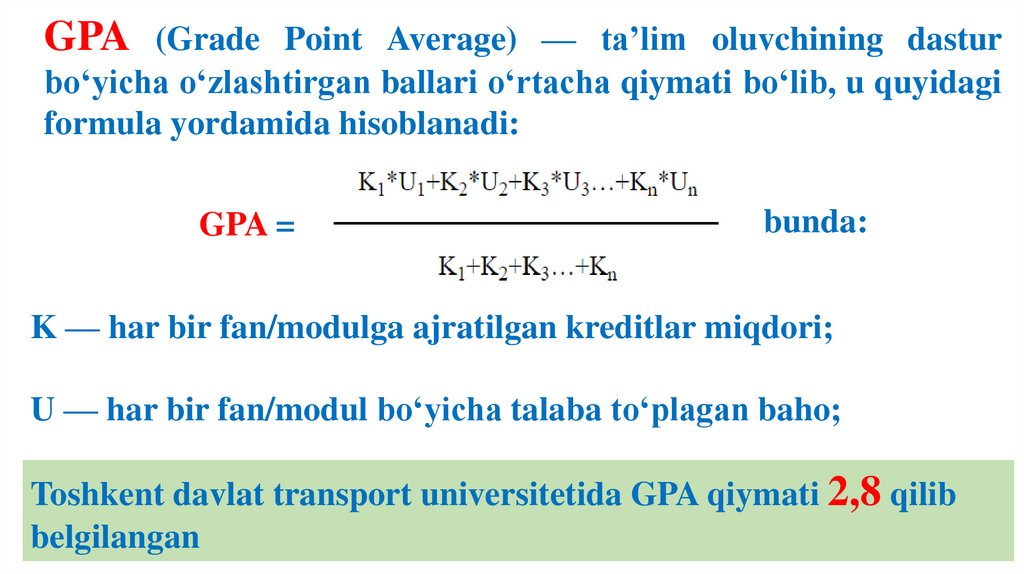 Toshkent davlat transport universitetida GPA qiymati 2,8 qilib