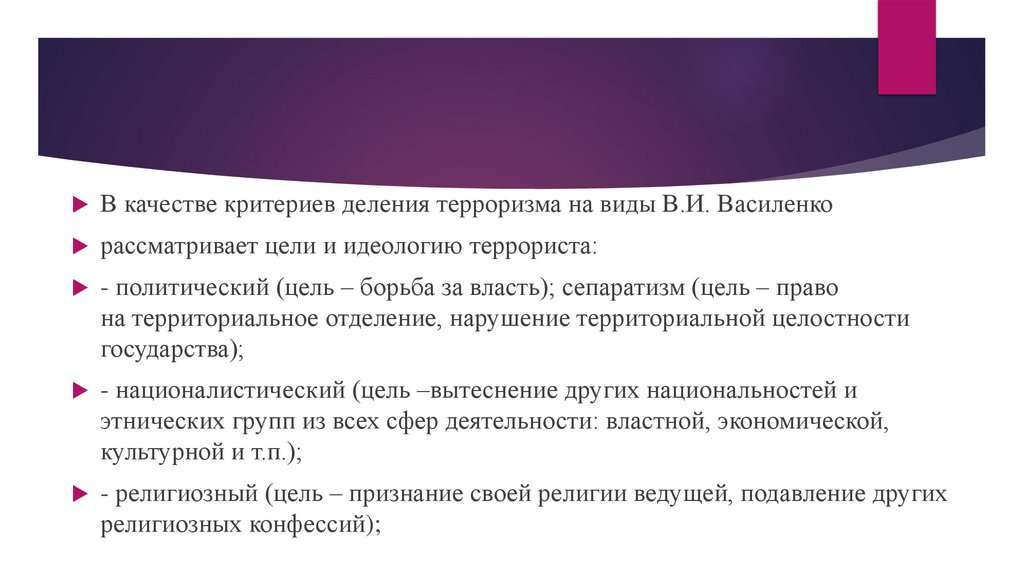 В качестве критериев деления терроризма на виды В.И. Василенкорассматривает цели и идеологию террориста: