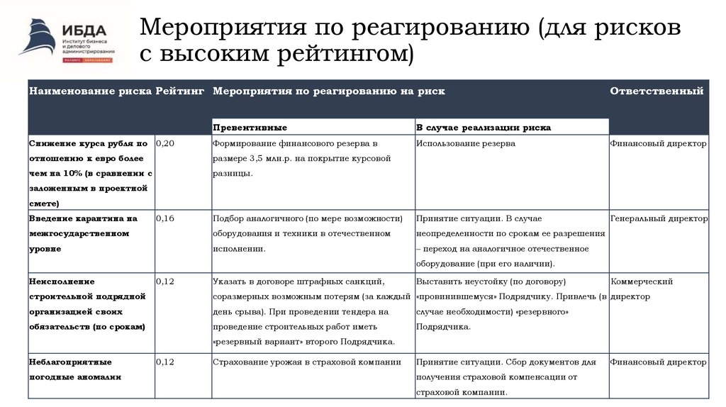 Наименование риска Рейтинг Мероприятия по реагированию на рискОтветственный