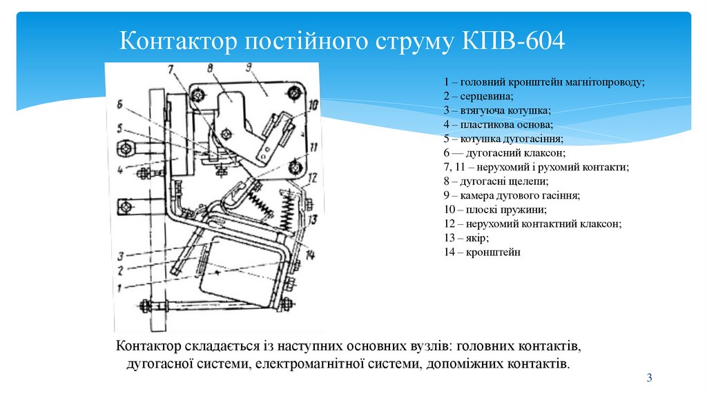 дугогасної системи, електромагнітної системи, допоміжних контактів.