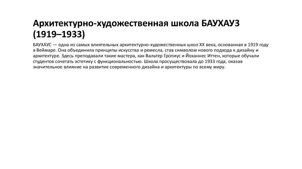 архитектуре. Здесь преподавали такие мастера, как Вальтер Гропиус и Йоханнес Иттен, которые обучали