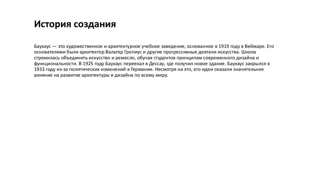История созданияБаухаус — это художественное и архитектурное учебное заведение, основанное в 1919 году в Веймаре. Его