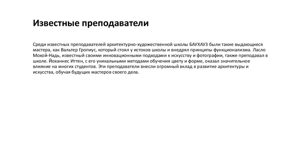 Известные преподавателиСреди известных преподавателей архитектурно-художественной школы БАУХАУ3 были такие выдающиеся