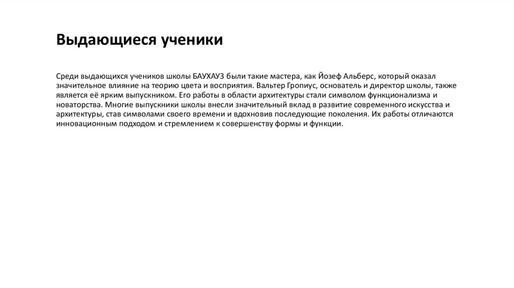 Выдающиеся ученикиСреди выдающихся учеников школы БАУХАУ3 были такие мастера, как Йозеф Альберс, который оказал
