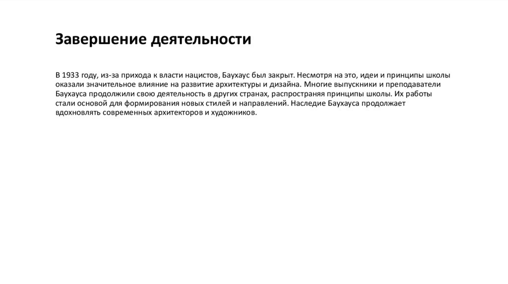 Завершение деятельностиВ 1933 году, из-за прихода к власти нацистов, Баухаус был закрыт. Несмотря на это, идеи и принципы школы