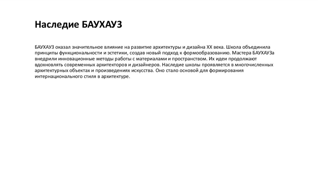 Влияние на архитектуруБаухаус оказал значительное влияние на архитектуру, внедрив принципы функциональности и