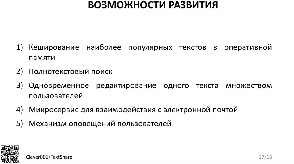 ВОЗМОЖНОСТИ РАЗВИТИЯ1) Кеширование наиболее популярных текстов в оперативной