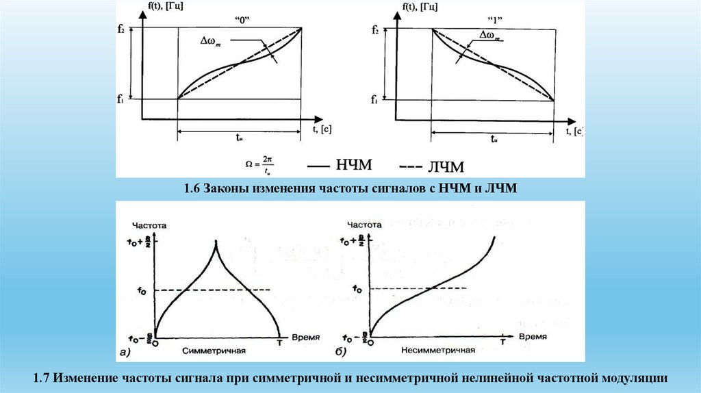 1.6 Законы изменения частоты сигналов с НЧМ и ЛЧМ1.7 Изменение частоты сигнала при симметричной и несимметричной нелинейной частотной модуляции