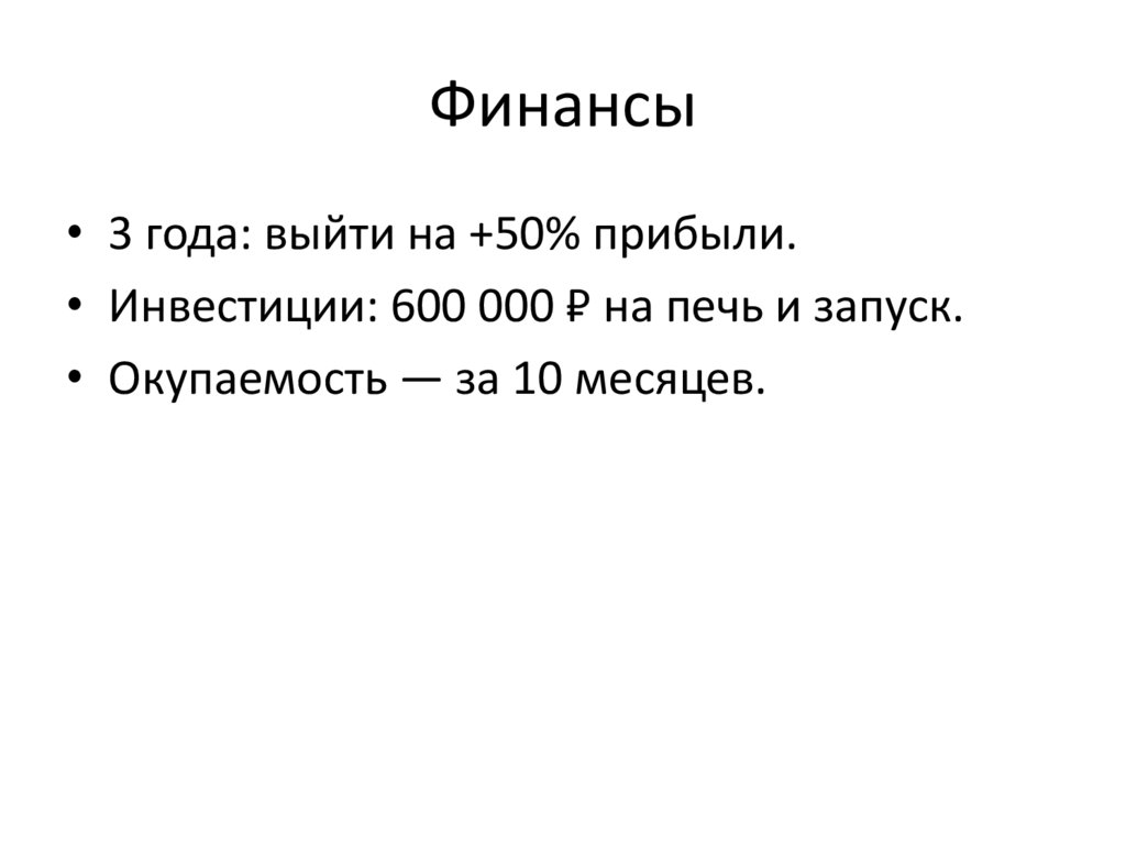 Финансы• 3 года: выйти на +50% прибыли.