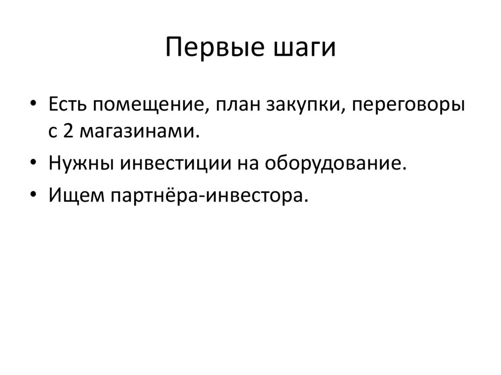 Первые шаги• Есть помещение, план закупки, переговоры