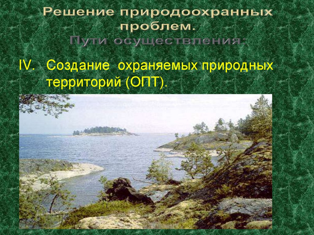 IV. Создание охраняемых природныхтерриторий (ОПТ).
