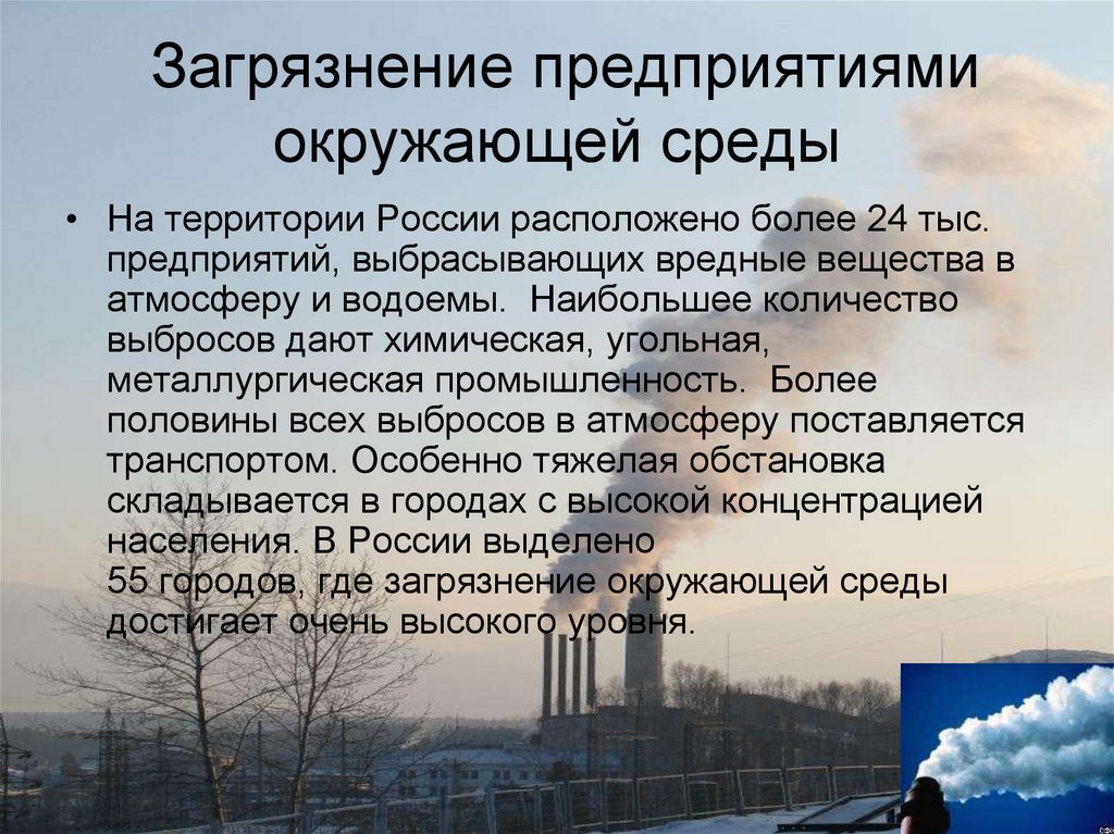 • На территории России расположено более 24 тыс.предприятий, выбрасывающих вредные вещества в