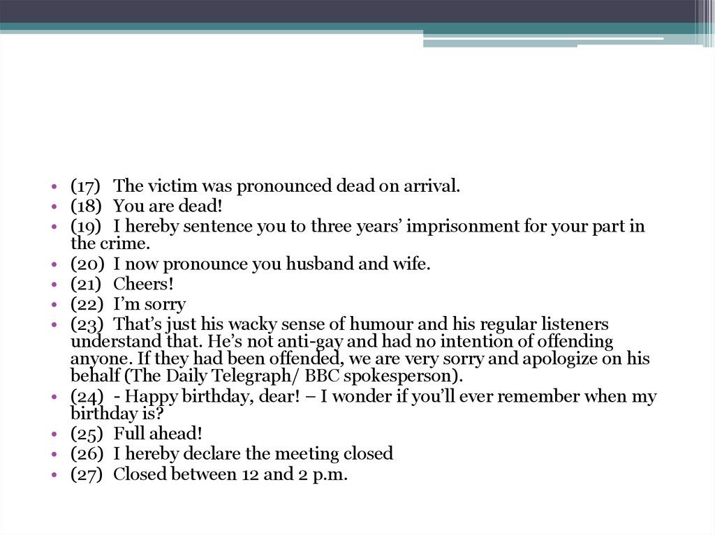• (17) The victim was pronounced dead on arrival.• (18) You are dead!