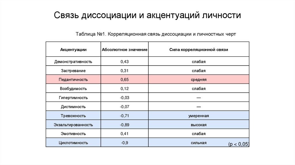 Таблица №1. Корреляционная связь диссоциации и личностных чертАкцентуации