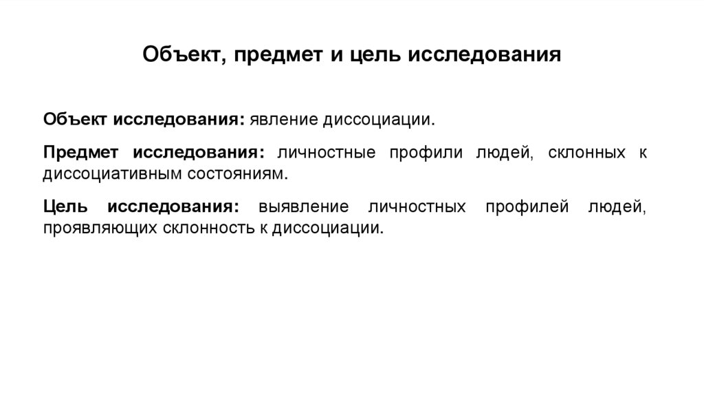 Объект исследования: явление диссоциации.Предмет исследования: личностные профили людей, склонных к