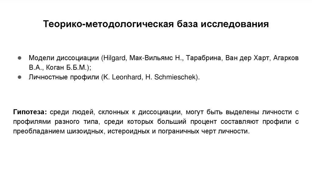 ● Модели диссоциации (Hilgard, Мак-Вильямс Н., Тарабрина, Ван дер Харт, АгарковВ.А., Коган Б.Б.М.);