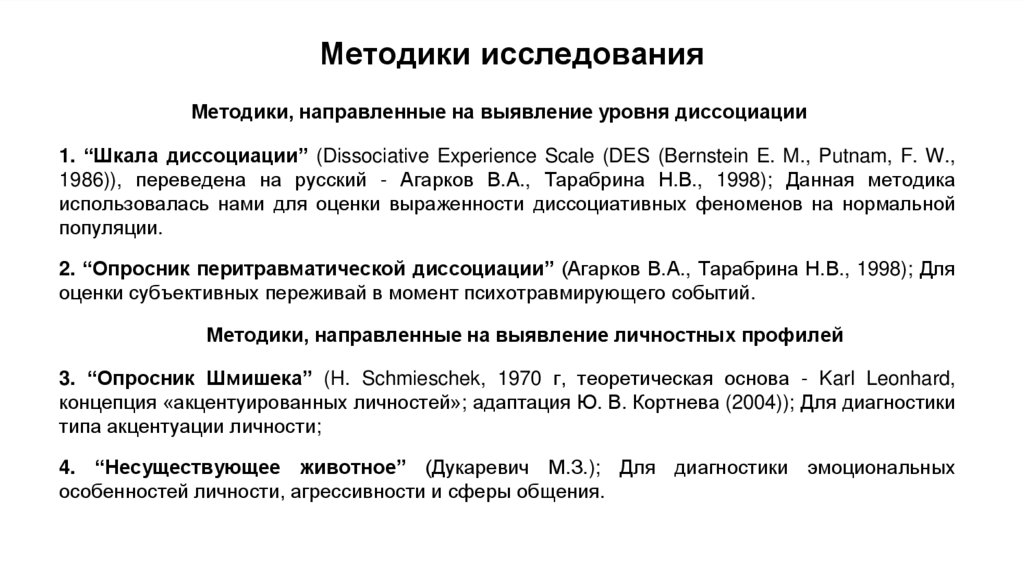 2. “Опросник перитравматической диссоциации” (Агарков В.А., Тарабрина Н.В., 1998); Для