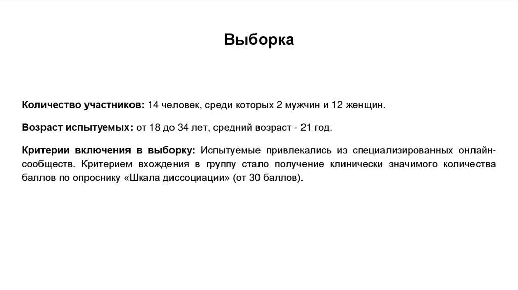 Критерии включения в выборку: Испытуемые привлекались из специализированных онлайнсообществ. Критерием вхождения в группу стало получение клинически значимого количества