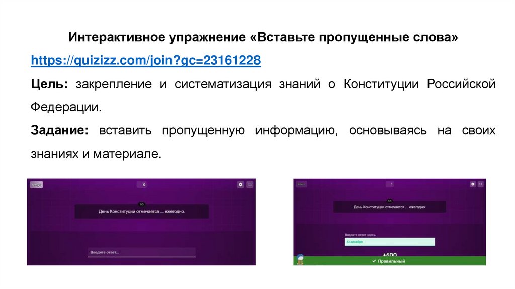 Интерактивное упражнение «Вставьте пропущенные слова»https://quizizz.com/join?gc=23161228