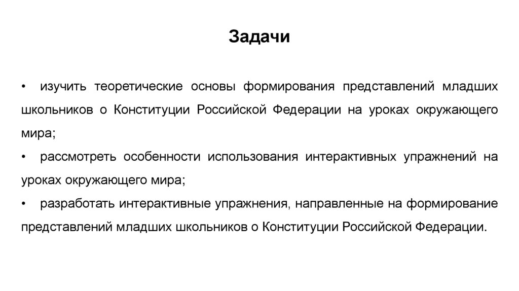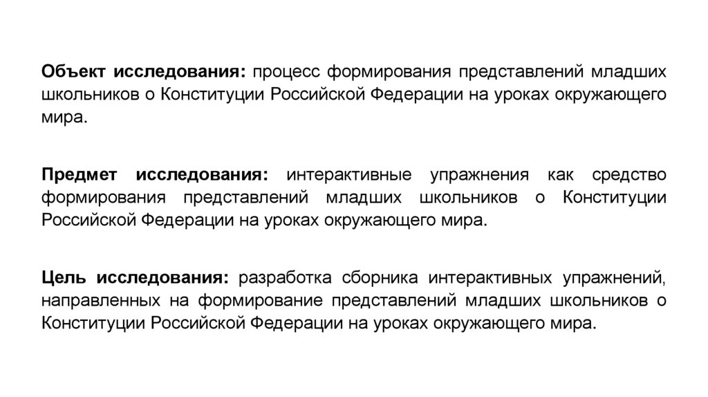 Объект исследования: процесс формирования представлений младшихшкольников о Конституции Российской Федерации на уроках окружающего