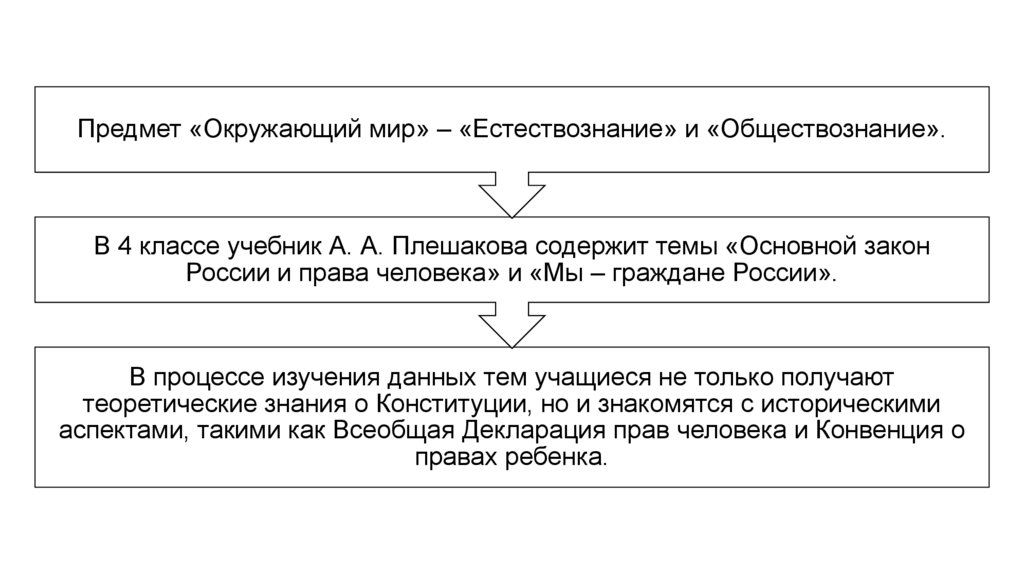 Предмет «Окружающий мир» – «Естествознание» и «Обществознание».В 4 классе учебник А. А. Плешакова содержит темы «Основной закон