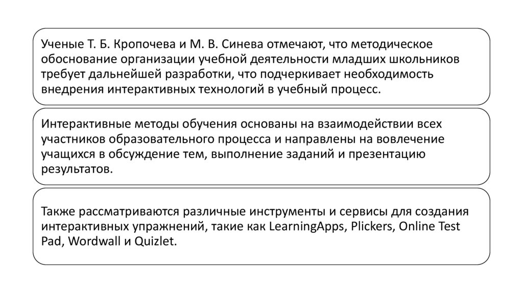 Ученые Т. Б. Кропочева и М. В. Синева отмечают, что методическоеобоснование организации учебной деятельности младших школьников