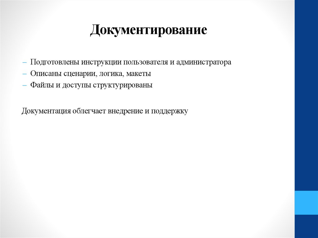‒ Подготовлены инструкции пользователя и администратора‒ Описаны сценарии, логика, макеты