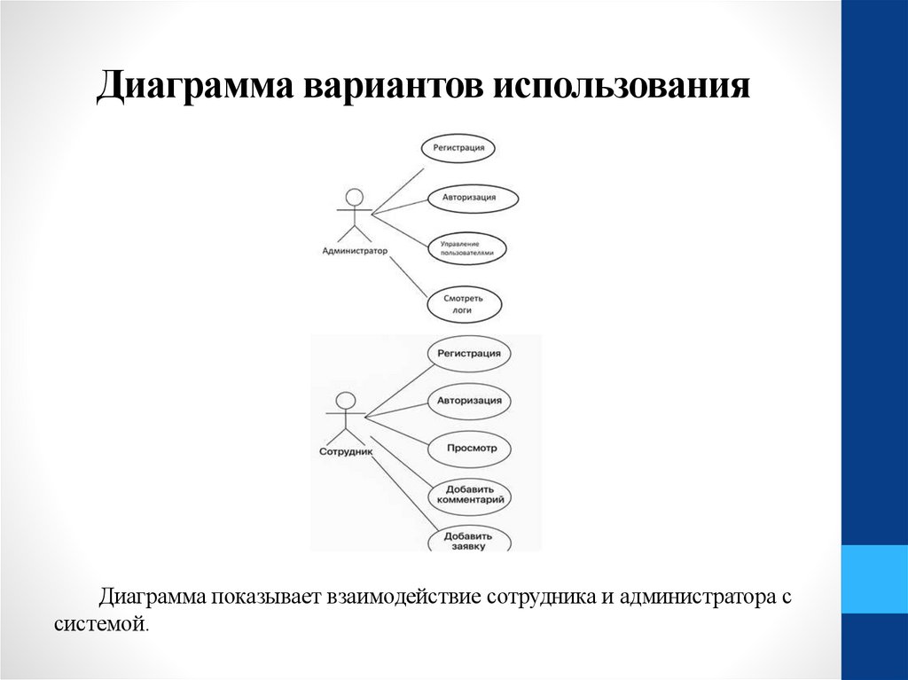 Диаграмма показывает взаимодействие сотрудника и администратора ссистемой.