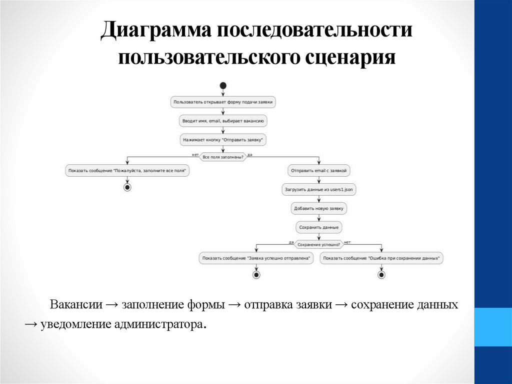 Вакансии → заполнение формы → отправка заявки → сохранение данных→ уведомление администратора.