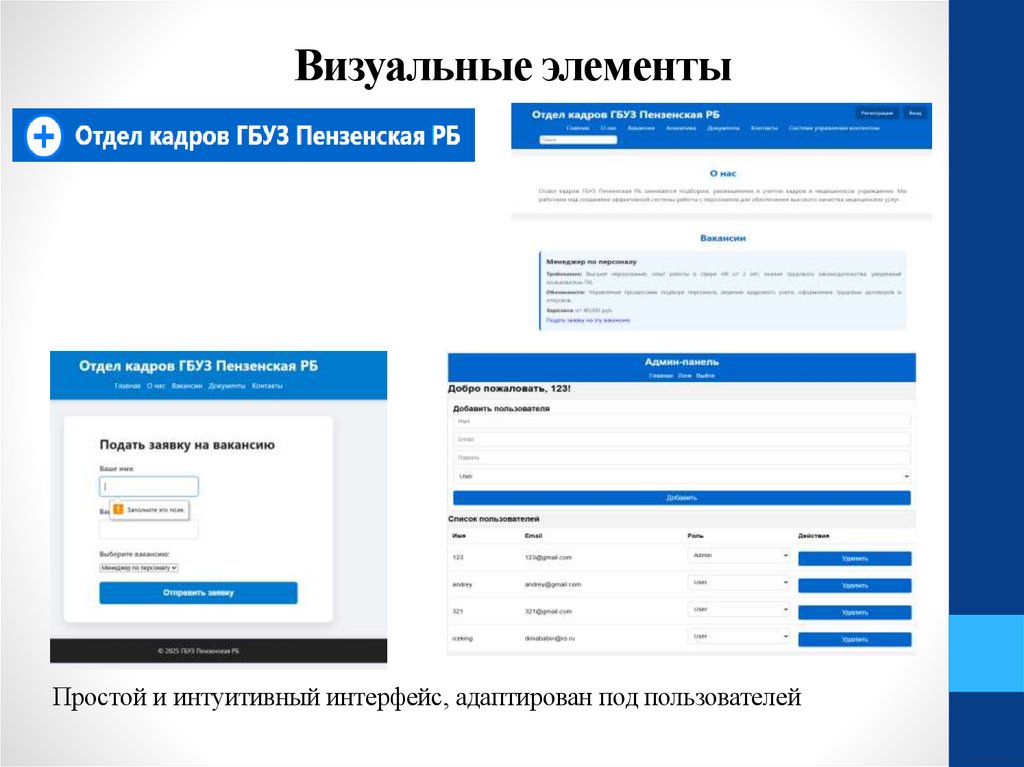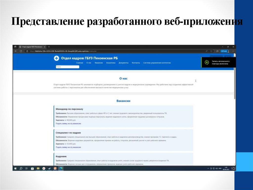 Структура базы данных: пользователи, заявки, вакансии, логирование9. Представление разработанного веб-приложения