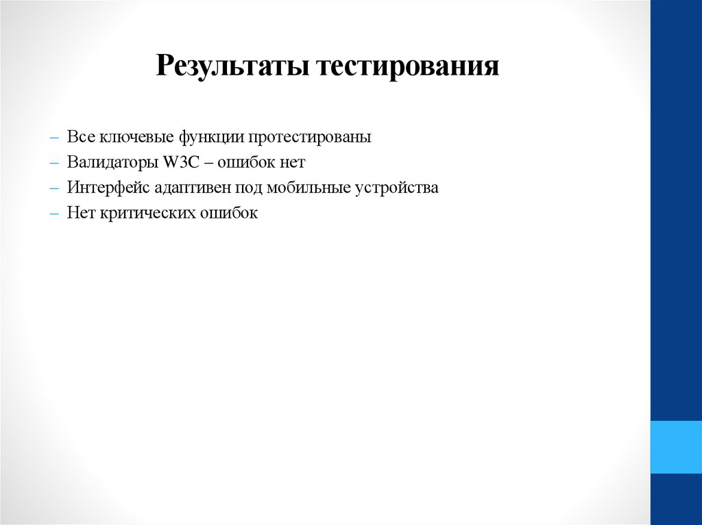‒ Все ключевые функции протестированы‒ Валидаторы W3C – ошибок нет