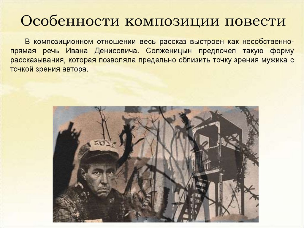 Особенности композиции повестиВ композиционном отношении весь рассказ выстроен как несобственнопрямая речь Ивана Денисовича. Солженицын предпочел такую форму